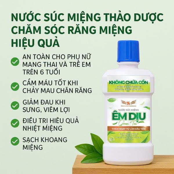 Với công thức thảo mộc an toàn, Nước súc miệng thảo mộc Êm Dịu không chỉ giúp làm sạch răng miệng mà còn mang lại cảm giác dễ chịu, bảo vệ nướu và giữ hơi thở thơm mát dài lâu. Đây là sự lựa chọn hoàn hảo cho cả gia đình trong hành trình chăm sóc sức khỏe răng miệng mỗi ngày.